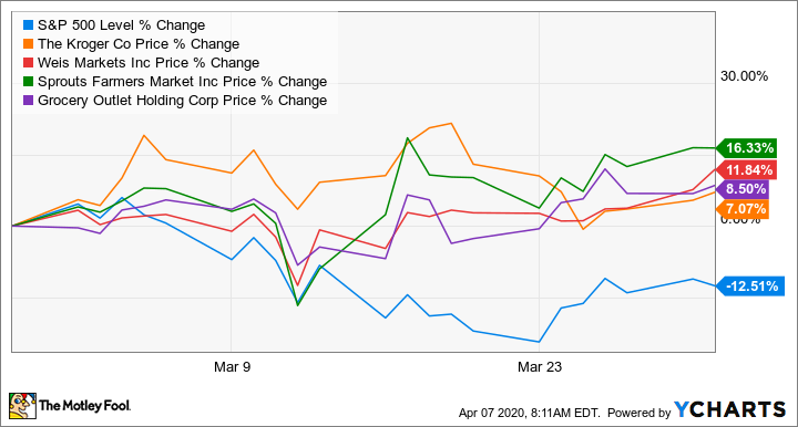The stock market had a terrible time in March, but try telling that to grocery stocks. An investment in Sprouts Farmers Market (SFM 0.83%), Weis Markets (WMK 7.29%), Grocery Outlet Holdings (GO 1.80%), and Kroger (KR +0.56%) would have all beaten the market during the month.