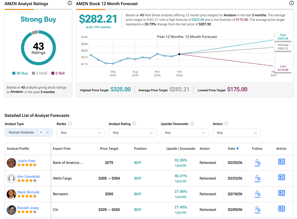 Turning to Wall Street, analysts have a Strong Buy consensus rating on AMZN stock based on 40 Buys and three Holds assigned in the past three months, as indicated by the graphic below. Furthermore, the average AMZN price target of $282.21 per share implies 35.73% upside potential.