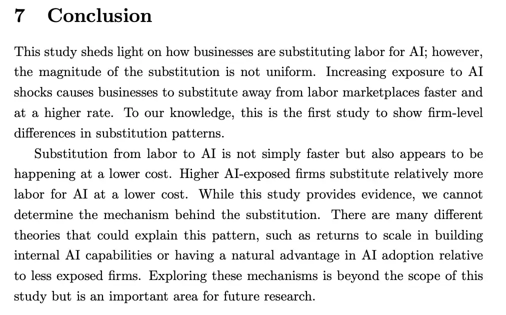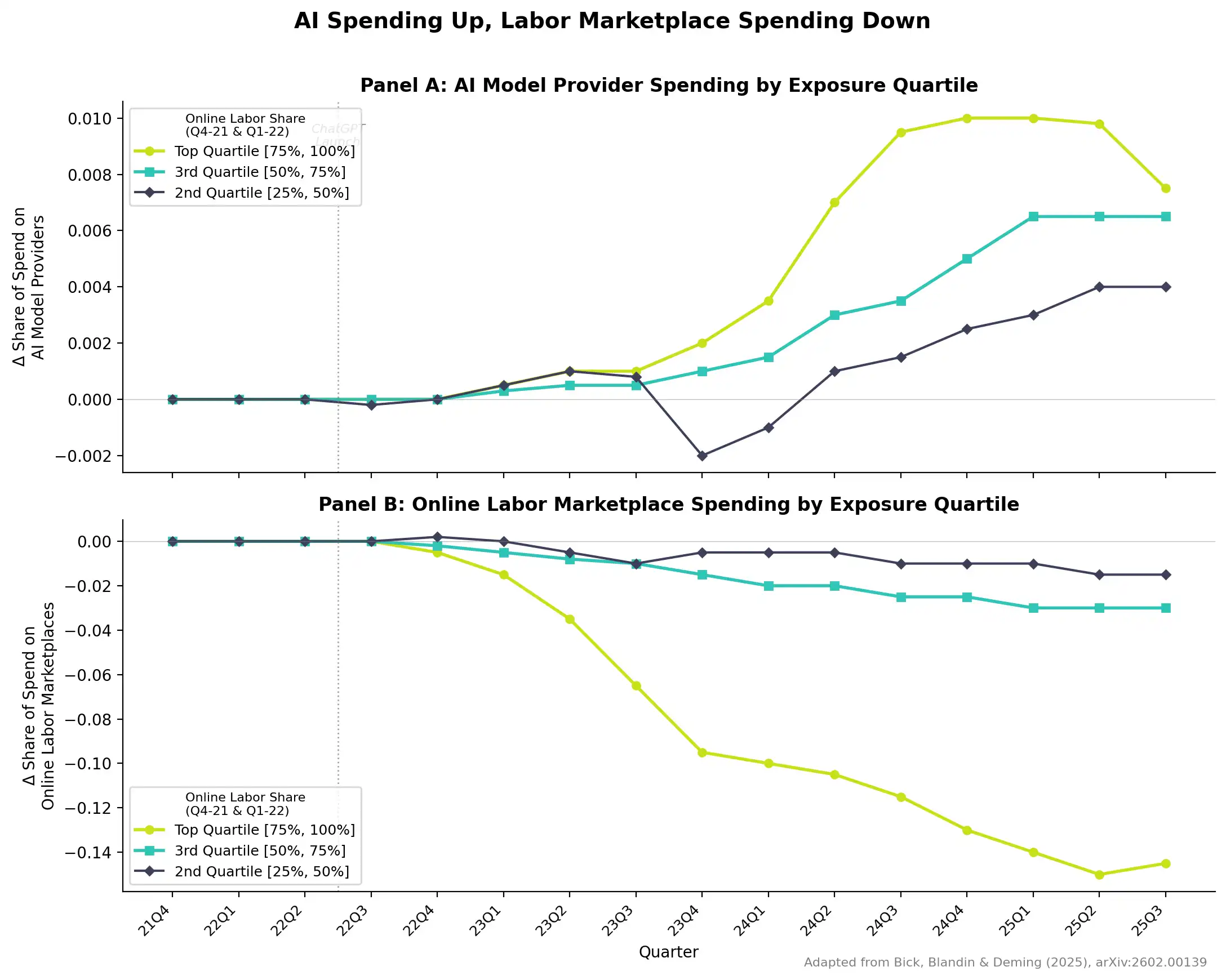 There is evidence supporting Citrini’s view. An empirical study by Bick, Blandin, and Deming, based on corporate expenditure data, shows that after ChatGPT’s release, companies with the highest AI exposure (those that previously spent most on online labor markets) significantly increased their spending on AI model providers while reducing online labor market expenditures, by about 15%. Notably, this substitution isn’t “one-to-one”—for every dollar cut from labor market spending, companies only increased AI spending by about 0.03 to 0.30 dollars. In other words, AI is doing the same work at a fraction of the human cost.