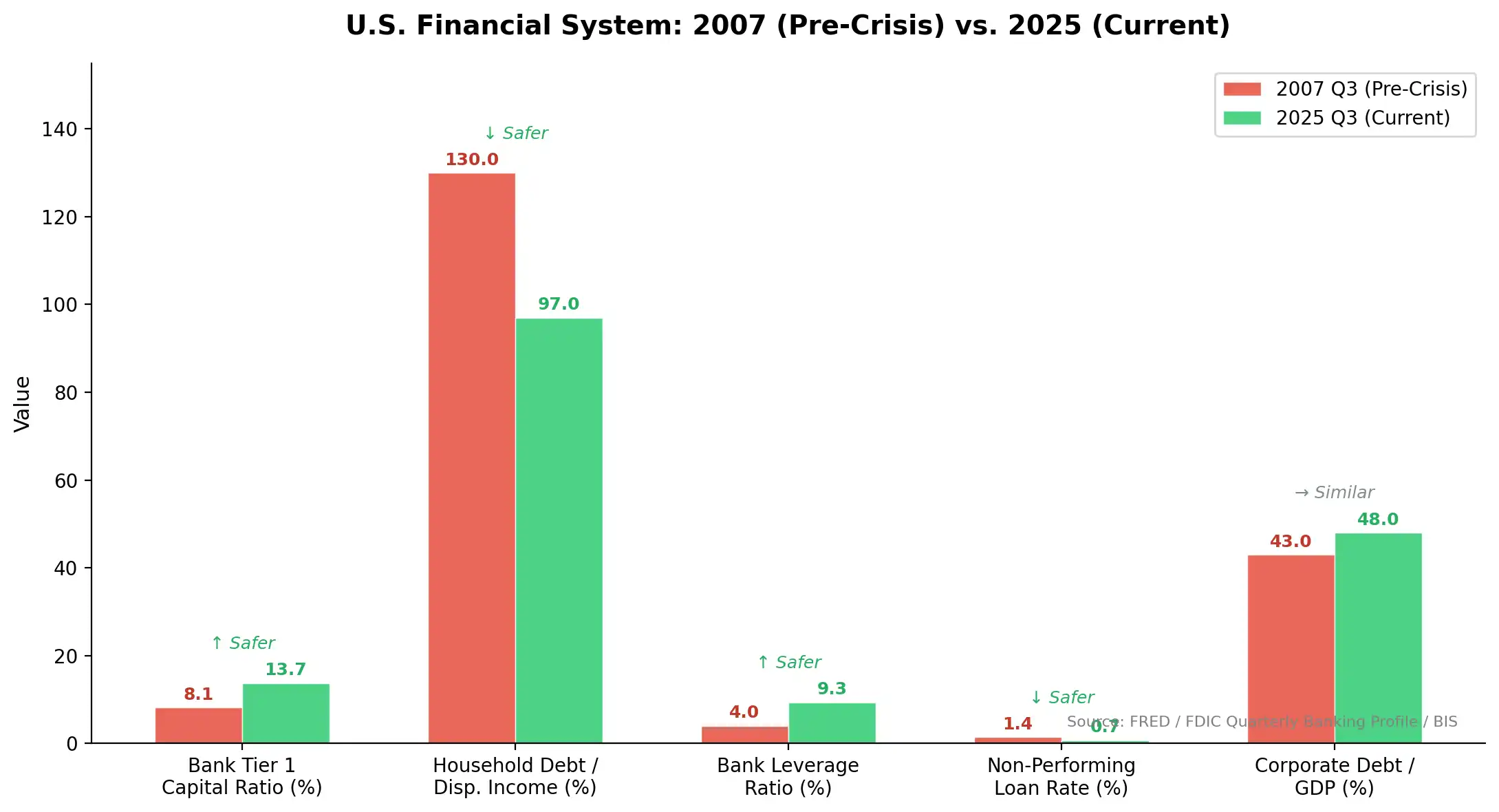Compared to the pre-2008 financial crisis, the resilience indicators of the current U.S. financial system have improved significantly: Tier 1 capital ratios rose from 8.1% to 13.7%, household debt-to-disposable income ratio fell from 130% to 97%, and non-performing loan rates dropped from 1.4% to 0.7%.