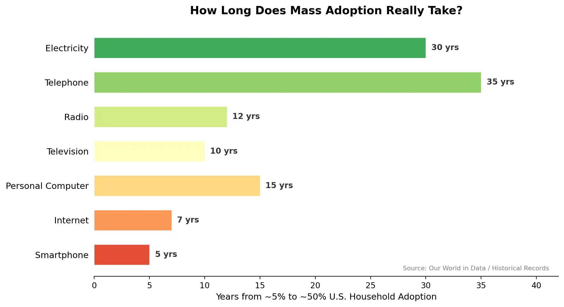 In fact, every wave of general-purpose technology from labs to widespread adoption has historically been slower than the technology’s own maturity. It took 30 years for electricity to go from 5% to 50% household penetration; 35 years for telephones; even the fastest-growing smartphones took 5 years. AI’s capabilities may already threaten many industries, but the gap between technological potential and institutional capacity to absorb it is never bridged solely by technological ability.