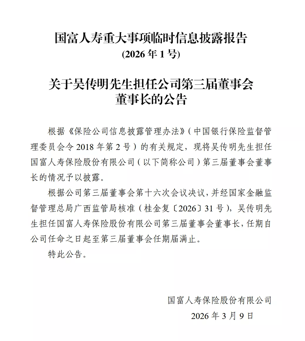 On March 9th, Guofu Life Insurance announced that, according to the resolution of the 16th meeting of the company’s third board of directors and approved by the Guangxi Regulatory Bureau of the China Banking and Insurance Regulatory Commission (Guojinfu [2026] No. 31), Wu Chuanming will serve as Chairman of the Third Board of Directors of Guofu Life Insurance Co., Ltd., with a term starting from the date of appointment until the expiration of the third board’s term.