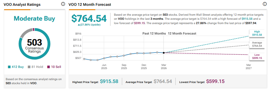 According to TipRanks’ unique ETF analyst consensus, determined based on a weighted average of analyst ratings on its holdings, VOO is a Moderate Buy. The Street’s average price target of $764.54 implies an upside of 27.86%.