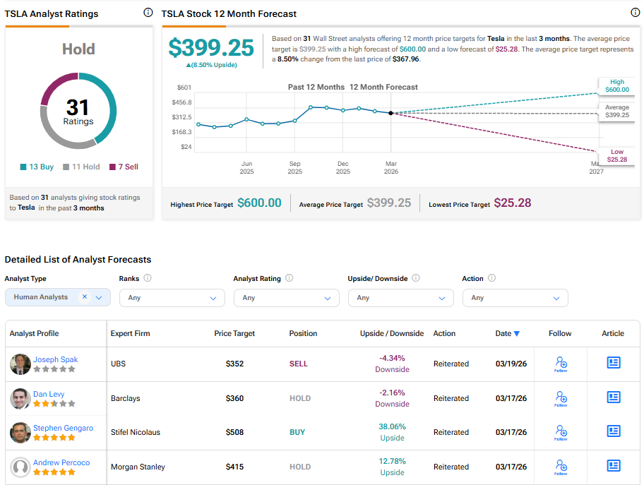 Turning to the Street, Tesla Inc. has a Hold consensus view, based on 31 analysts’ ratings. The average TSLA stock price target is $399.25, implying an 8.50% upside from the current price.
