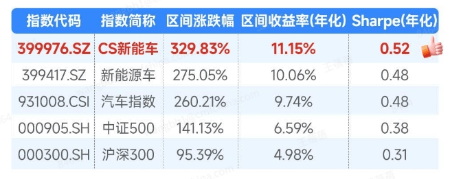 Long-term, the CSI New Energy Vehicle Index has outperformed mainstream broad-based and similar indices, with higher resilience. Since its base date, as of March 19, 2026, the index has gained 329.83%, with an annualized return of 11.15%, and a Sharpe ratio of 0.52, outperforming the China New Energy Vehicle Index, CSI Auto Index, CSI 300, and CSI 500 over the same period.