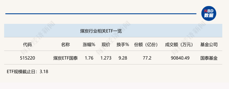 Commentary: The China National Coal ETF (515220) rose by 1.76% this morning. The ETF has 7.72 billion shares outstanding, with a half-day trading volume of 908 million yuan. It tracks the CSI Coal Index, which includes listed companies involved in coal mining and processing, reflecting the overall performance of coal-related listed companies.
