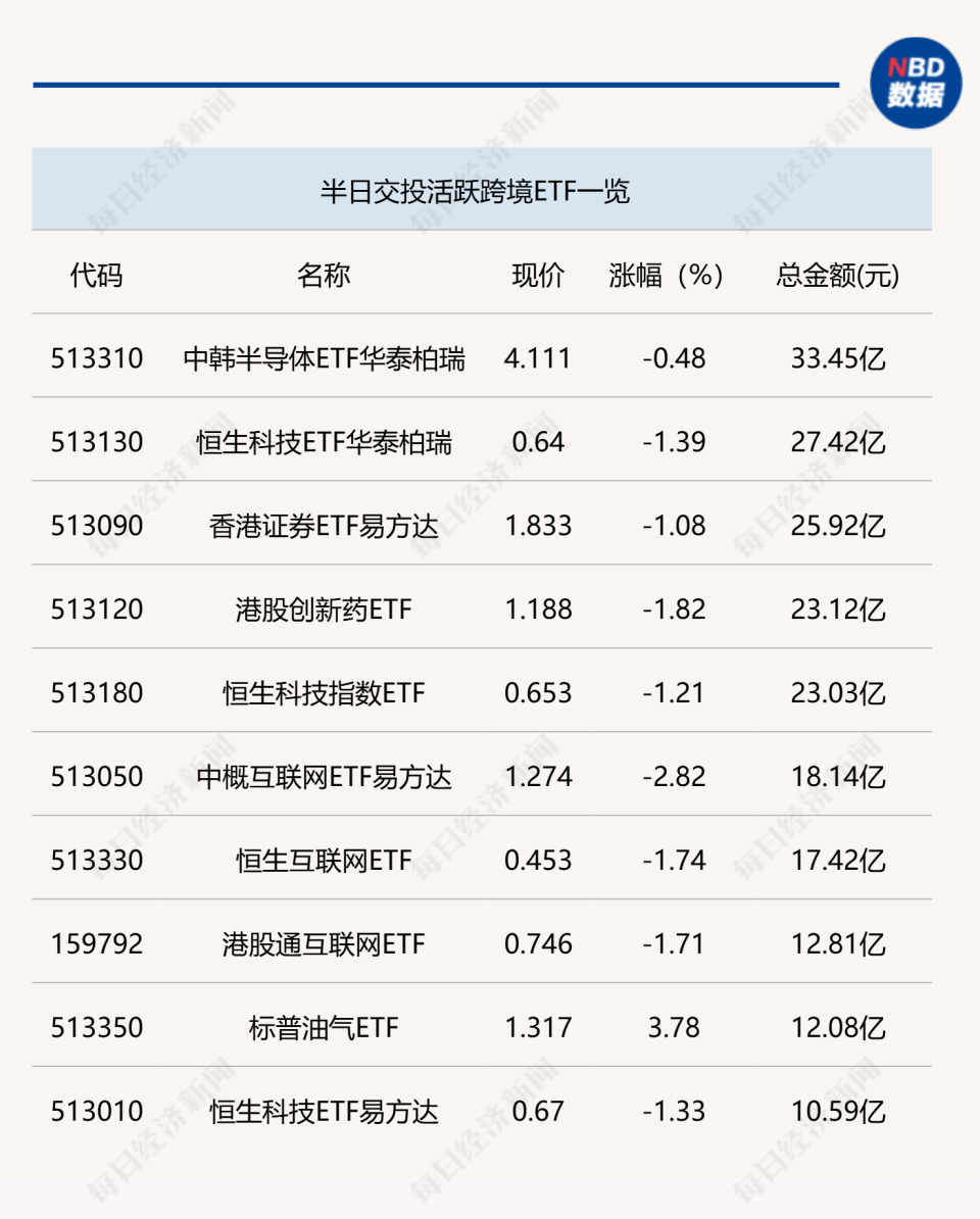 This morning, the ETFs with significant price movements included the Non-Ferrous Metals ETF (512400), Power Grid Equipment ETF (159326), and Chemical ETF (159870), all of which had trading volumes exceeding 1 billion yuan in the first half of the day. In cross-border ETFs, the China-Korea Semiconductor ETF Huatai Bairui (513310) traded 3.345 billion yuan in the first half of the day, indicating relatively high trading volume.
