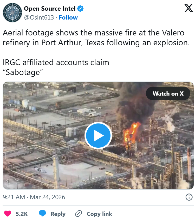 On March 23, local time, a Valero refinery in Port Arthur, Texas, exploded and caught fire on a large scale. According to Bloomberg, citing sources familiar with the matter, the fire originated from a diesel hydrodesulfurization unit, which was severely damaged, causing the fire to spread to nearby Fluid Catalytic Cracking (FCC) units. Some parts of the refinery have been shut down; whether the entire plant is halted remains pending final management decisions.