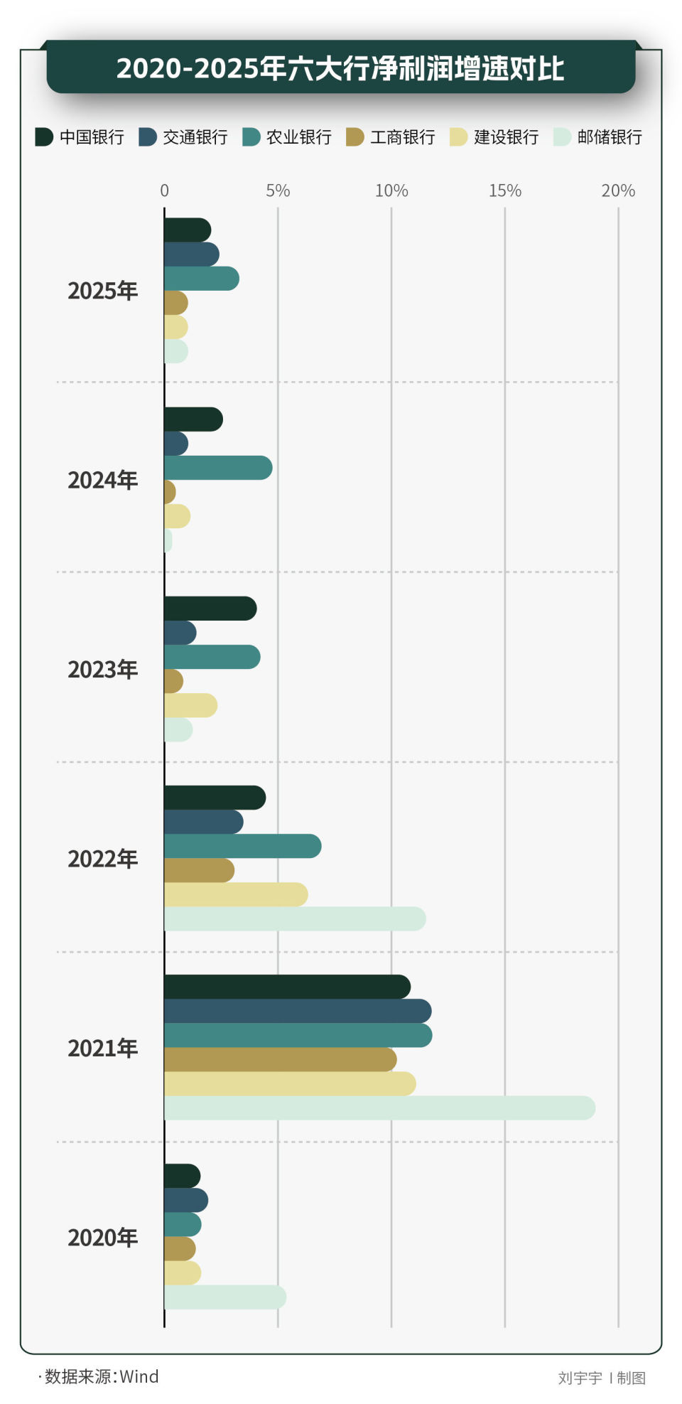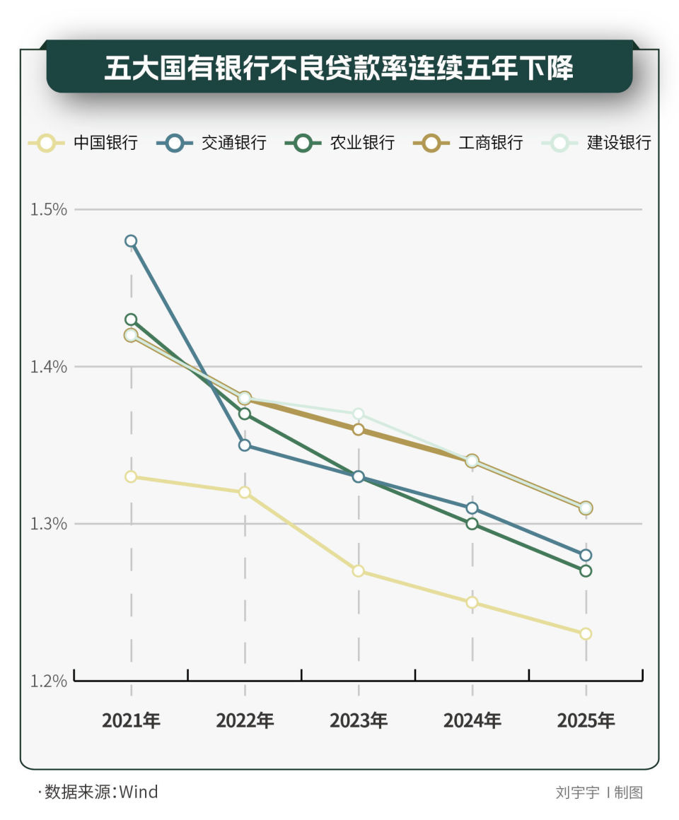 With the full release of the annual reports for 2025 from the six state-owned major banks, the strengths and weaknesses in vying for key performance indicators have been made clear. In a headwind environment where net interest margins are generally narrowing, all six banks have held the “double growth” bottom line for revenue and net profit, and among them five banks have achieved a “five-in-a-row” decline in their non-performing loan ratios.