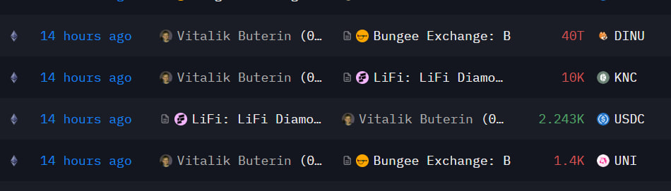 Alongside Uniswap, Buterin has also dumped 10,000 KNC and 40 trillion DINU tokens, netting 16,796 USDC.