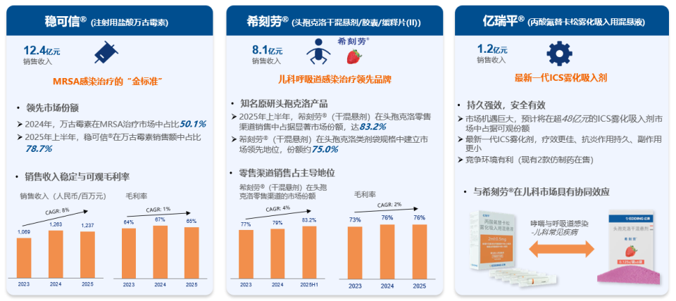 Wei-kson® as the “gold standard” for MRSA infection treatment dominates the vancomycin market in China, with a market share of 78.7%. At the same time, because it is a special-use antibiotics, the clinical usage risk is high. After consultation with departments and experts, it was not included in the 11th batch of national centralized drug procurement catalogs. The future market space and competitive advantages are solid. Hesikelao® is the leading brand for pediatric respiratory infection treatment. Its dry powder suspension holds a remarkable 83.2% market share in the cefclor retail channel, and it has also established an approximately 75.0% leading position in the specification of cefclor bag formats. Weiriping® as the latest generation of ICS nebulized inhalation formulation has better efficacy, more durable anti-inflammatory effects, and fewer side effects. It has good synergy with Hesikelao in the pediatric market.