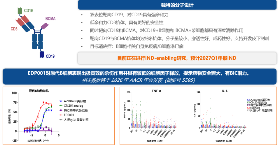 Eternity J&J also ventures into the promising field of autoimmune diseases. EDP001 is a highly innovative four-specificity T-cell engager (Tetra-specific TCE) targeting CD3/CD19/CD19/BCMA. It can overcome antigen escape while enhancing specificity. Preclinical studies have confirmed that it shows highly efficient killing against primary B cells and has a low cytokine release profile, suggesting a wide safety window and BIC potential. Relevant data will be published at the 2026 AACR Annual Meeting.