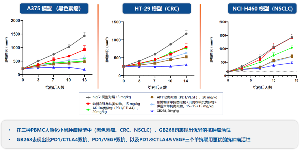In cynomolgus monkey toxicology studies, GB268’s HNSTD was 200 mg/kg, which verified the excellent safety brought by the differentiated CTLA-4 antibody design in preclinical validation. In addition, in preclinical mouse tumor models, GB268 demonstrated better anti-tumor activity than the PD1/VEGF dual antibody, PD1/CTLA-4 dual antibody, and combinations of antibodies targeting three separate sites. As an IO 3.0 tri-specific antibody simultaneously targeting PD-1, VEGF, and CTLA-4, GB268 is expected to further improve efficacy beyond a PD-1/VEGF dual antibody. It could cover a broad population of patients with solid tumors, including those with lung cancer, colorectal cancer, liver cancer, gastric cancer, breast cancer, and other major tumor types—potentially replacing them to become a new star in the tumor immunotherapy field.