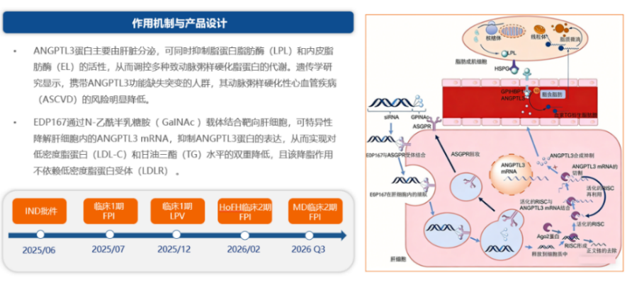 The Phase II clinical trial for the HoFH indication of EDP167 was initiated in February 2026 and is planned to complete the main trial evaluation by Q4. Phase III is scheduled to start in Q1 2027, with a chance to become the first domestically developed original siRNA drug approved for the HoFH indication. Mixed dyslipidemia plans to launch the Phase II clinical study in Q3 this year, and R&D progress in this indication ranks second among domestically developed siRNA drugs, placing it in the top tier.