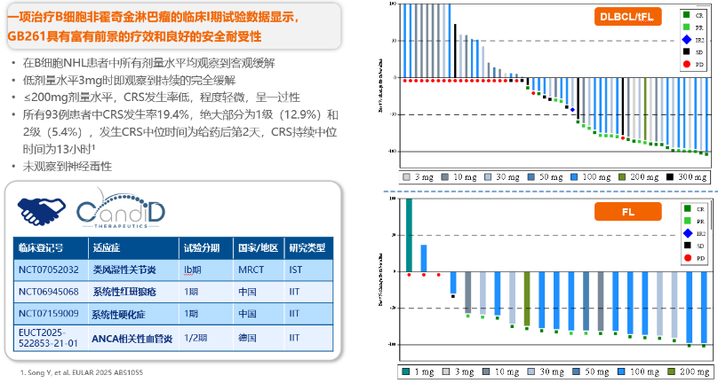 GB261 (CD3/CD20 bispecific antibody) has low CD3 binding affinity and maintains Fc function (ADCC and CDC). While improving safety, it kills tumor cells more effectively through multiple mechanisms. GB261 completed clinical Phase 1/2 dose-escalation in patients with B-cell lymphoma, showing a highly advantageous safety/efficacy balance. The Phase II clinical trial enrollment is expected to start in Q2 2026. In 2024, GB261 successfully went global. It granted global rights outside the Greater China region to U.S.-based Candid Therapeutics. Through the transaction, international market value was realized. In 2025, Eternity J&J, together with Candid Therapeutics, launched multiple clinical studies for autoimmune diseases worldwide.