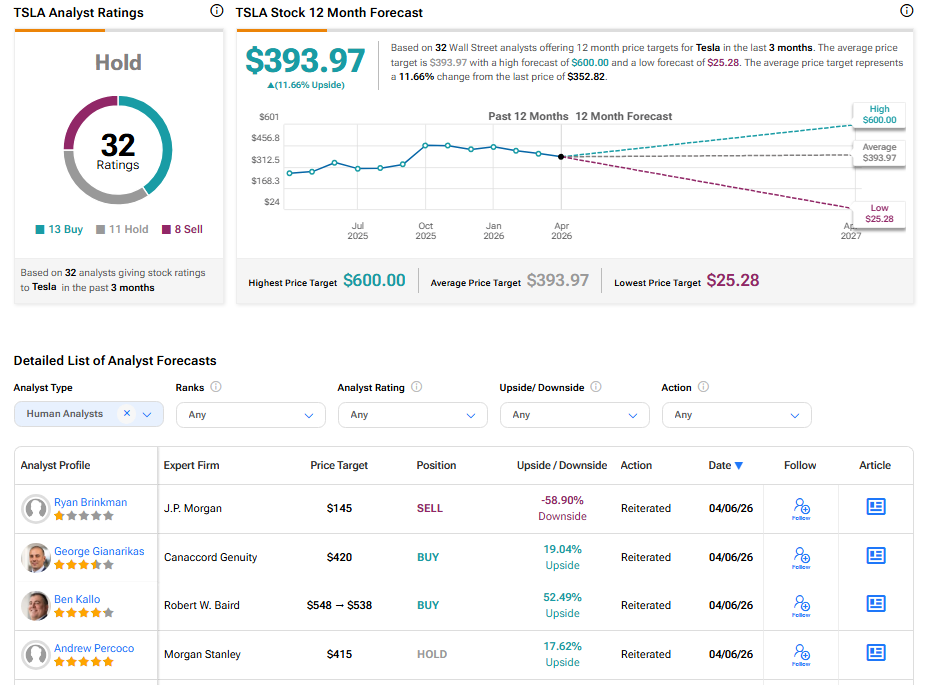 Tesla’s stock has a consensus Hold rating among 32 Wall Street analysts. That rating is based on 13 Buy, 11 Hold, and eight Sell recommendations issued in the last three months. The average TSLA price target of $393.97 implies 11.66% upside from current levels.