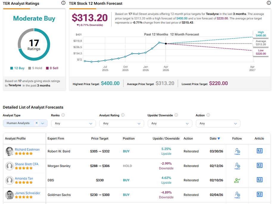 Wall Street has a Moderate Buy consensus rating on Teradyne stock based on 12 Buys and five Holds. The average TER stock price target of $313.20 indicates 0.71% downside potential.