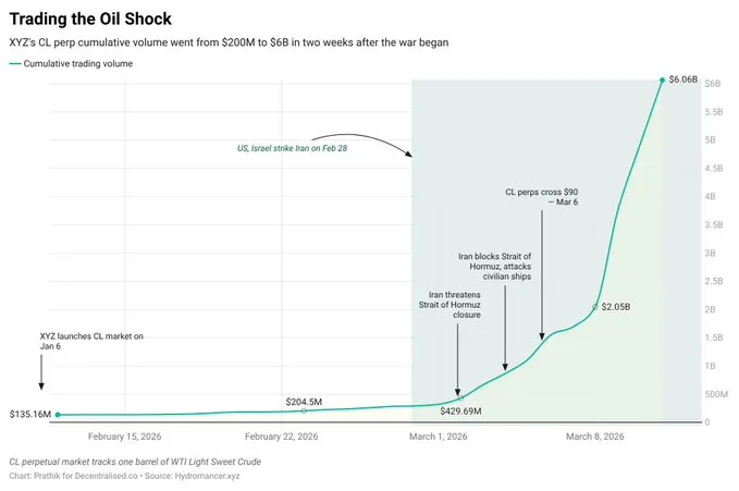 Just two weeks after the war broke out, the trading volume of oil-linked perpetual contracts surged from 200 million to a cumulative 6 billion.
