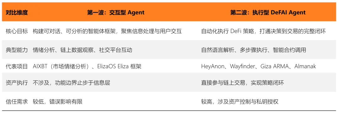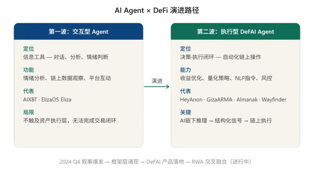 According to research from The Block, the evolution of DeFAI is not a single leap forward, but instead goes through two distinct stages—from early interaction-focused Agents centered on information processing, to today’s execution-focused systems that can truly intervene in on-chain operations.