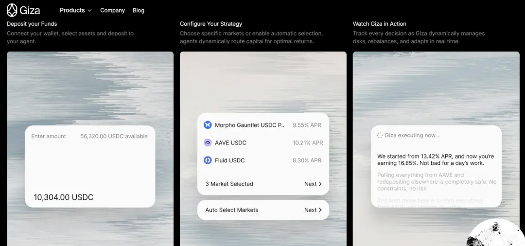 Taking Giza as an example: its ARMA Agent launched a stablecoin yield strategy on the Base network in February 2025. It continuously monitors interest-rate changes across protocols such as Aave, Morpho, Compound, and Moonwell. After considering protocol APY, fee costs, and liquidity, it intelligently dispatches users’ funds to maximize returns. According to public data, ARMA currently has about 60,000 unique holders, more than 36,000 deployed Agents, and manages assets (AUA) exceeding $20 million.