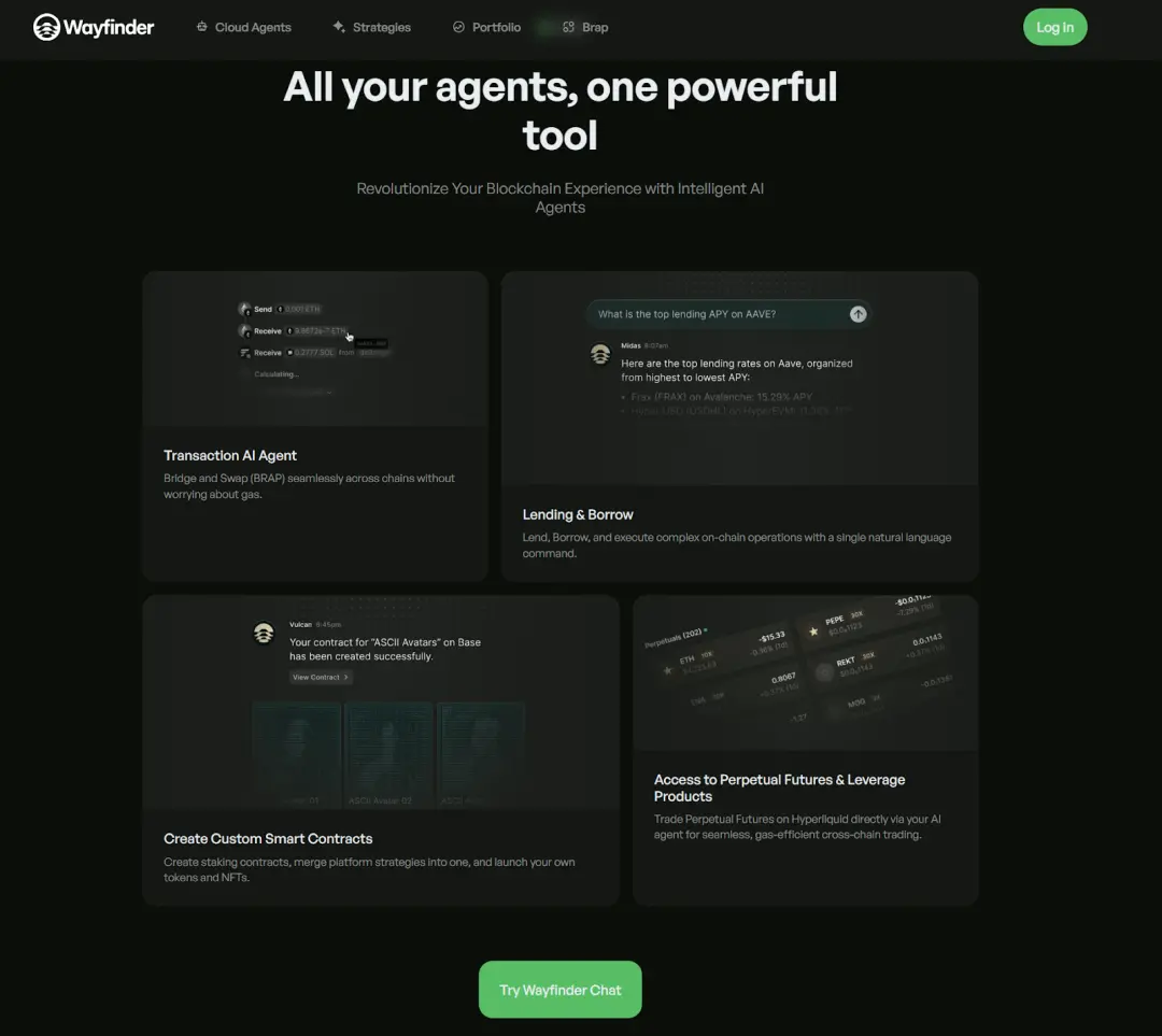Wayfinder, invested by Paradigm, provides an even further full-chain transaction service. Its AI Agent (called Shells) automatically finds the optimal transaction path across different chains, executing cross-chain transfers, token swaps, NFT interactions, and other operations. Users do not need to worry about underlying gas fees, cross-chain compatibility, and other technical details.