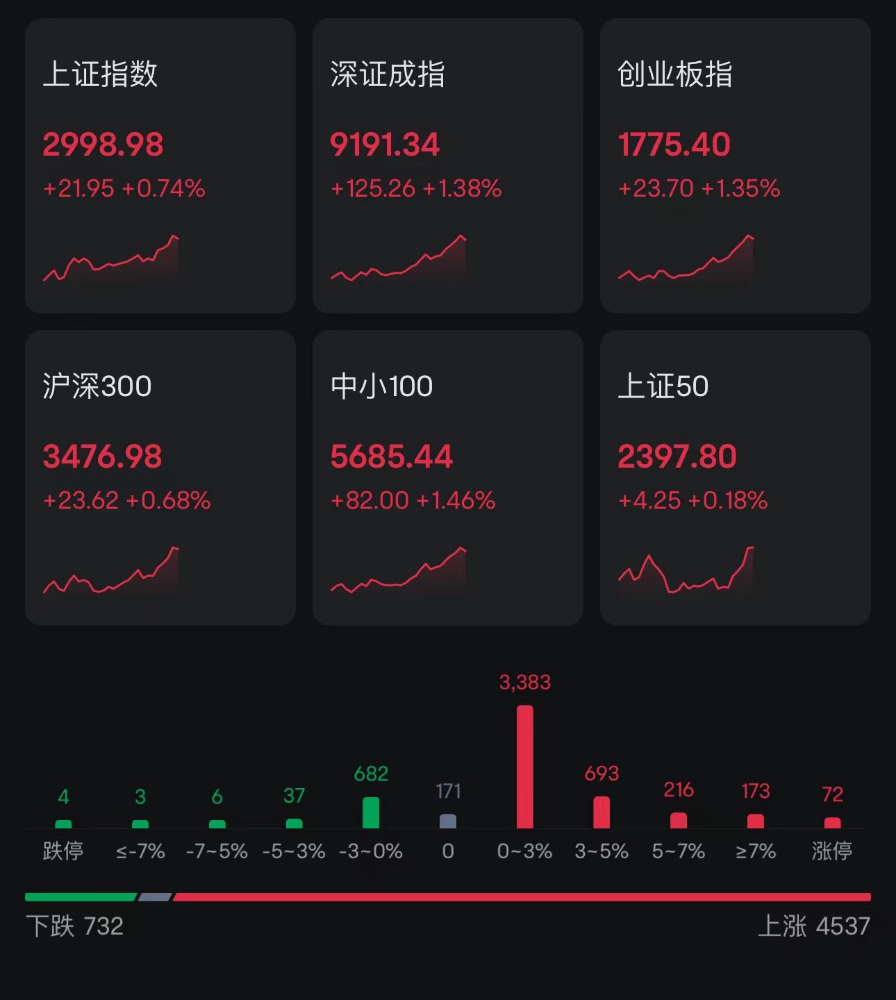 The A-shares strengthen, with the Shenzhen Component Index and the ChiNext Index both rising over 1%! Over 4,500 stocks are up, and northbound funds have a net buy of over 7 billion yuan in A-shares; ZTE Corporation hits the daily limit, and the computing power industry surges.