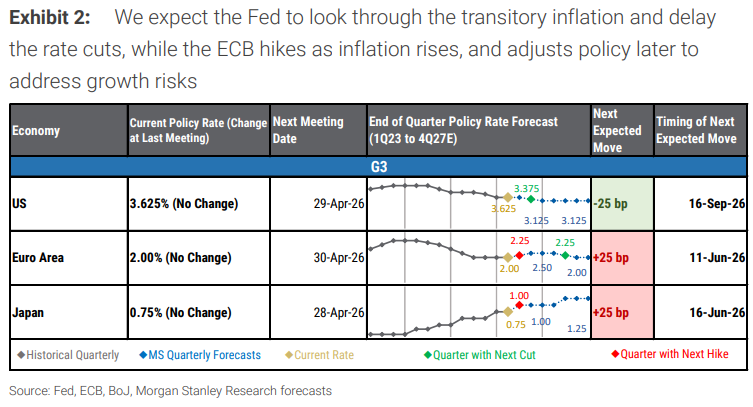 Central banks that are more sensitive to inflation expectations—especially the European Central Bank and the Bank of England—tend in the current environment to tighten policy further. According to their latest forecasts, the ECB’s next step is a 25-basis-point rate hike, with the timing expected in June 2026; the Bank of Japan is also expected to hike rates by 25 basis points in June 2026.