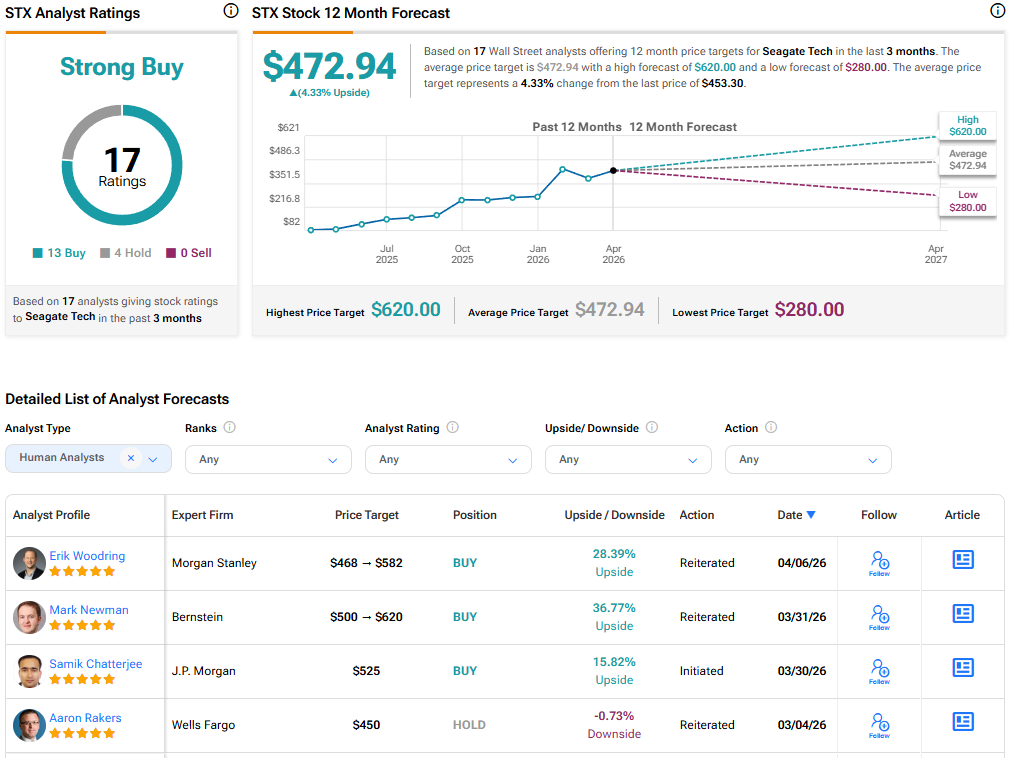 Overall, Wall Street has a Strong Buy consensus rating on Seagate Technology stock based on 13 Buys and four Holds. The average STX stock price target of $472.94 indicates 4.3% upside potential.