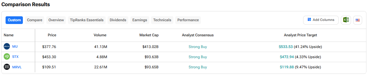 The rapidly growing artificial intelligence (AI) market has boosted demand for companies providing AI infrastructure, such as chips, networking solutions, and cooling systems. Despite macro uncertainty, Wall Street has a bullish rating on several AI infrastructure stocks based on expectations of continued AI-led demand. Using TipRanks’ Stock Comparison Tool, we placed Micron Technology MU +3.15% ▲ , Seagate Technology STX +5.58% ▲ , and Marvell Technology MRVL +2.24% ▲ against each other to find the AI infrastructure with the highest upside potential, according to Wall Street analysts.