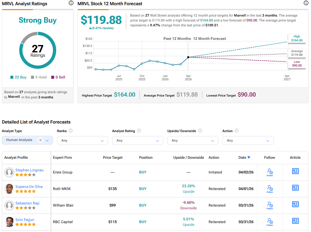Overall, Wall Street has a Strong Buy consensus rating on Marvell Technology stock based on 22 Buys and five Holds. The average MRVL stock price target of $119.88 indicates 9.5% upside potential.
