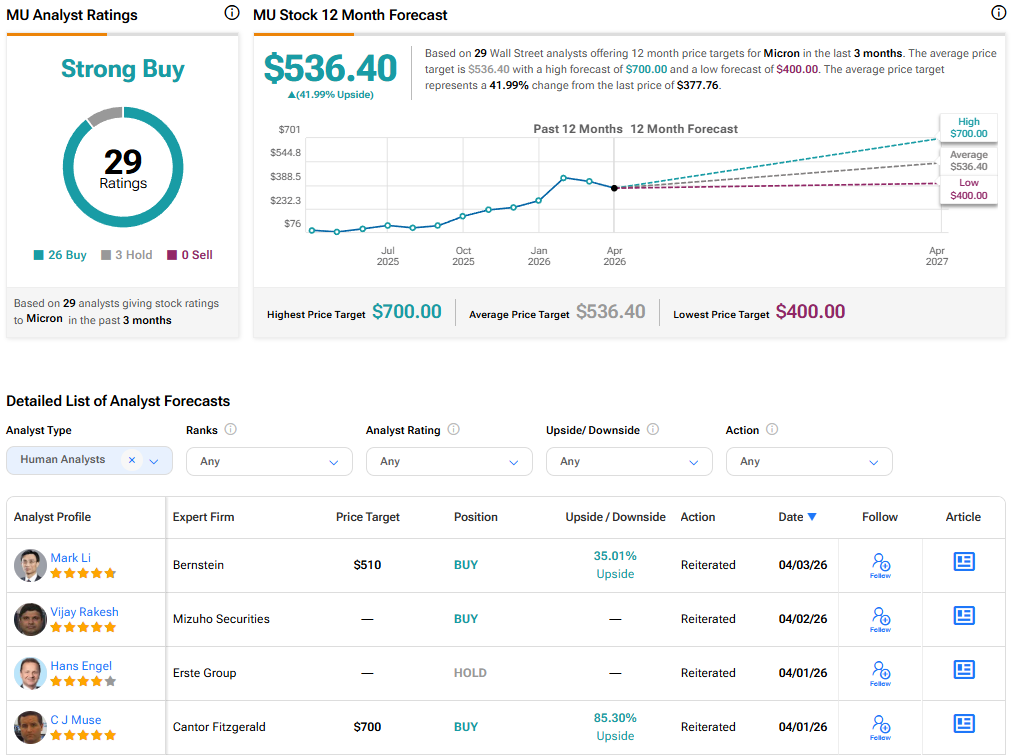 With 26 Buys and three Holds, Wall Street has a Strong Buy consensus rating on Micron stock. At $536.40, the average MU stock price target indicates about 42% upside potential.