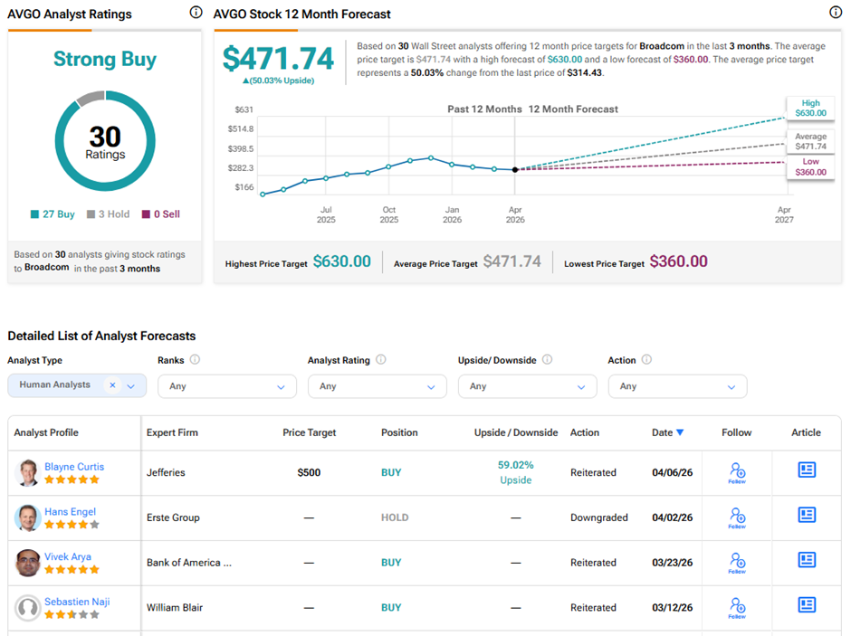 On TipRanks, AVGO stock has a Strong Buy consensus rating based on 27 Buys and three Hold ratings. The average Broadcom price target of $471.74 implies 50% upside potential from current levels. Over the past year, AVGO shares have surged 104%.