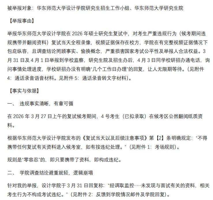 “I think it’s unfair, because Candidate No. 4 had violations during the re-examination process, so I started reporting it.” Mr. Wang said that on the morning of March 27, 2026, in the waiting area for the re-examination at the School of Design of East China Normal University. All candidates had signed the “Integrity Re-examination Commitment Letter,” and the on-site PPT clearly stated: “Do not bring any materials related to the re-examination into the waiting room. Anyone who violates will be handled according to disciplinary rules.” During the waiting period, Candidate No. 4 was called away from his seat by staff. After returning, he “held a folder in his hand and flipped through it.” Several other candidates around also saw this.