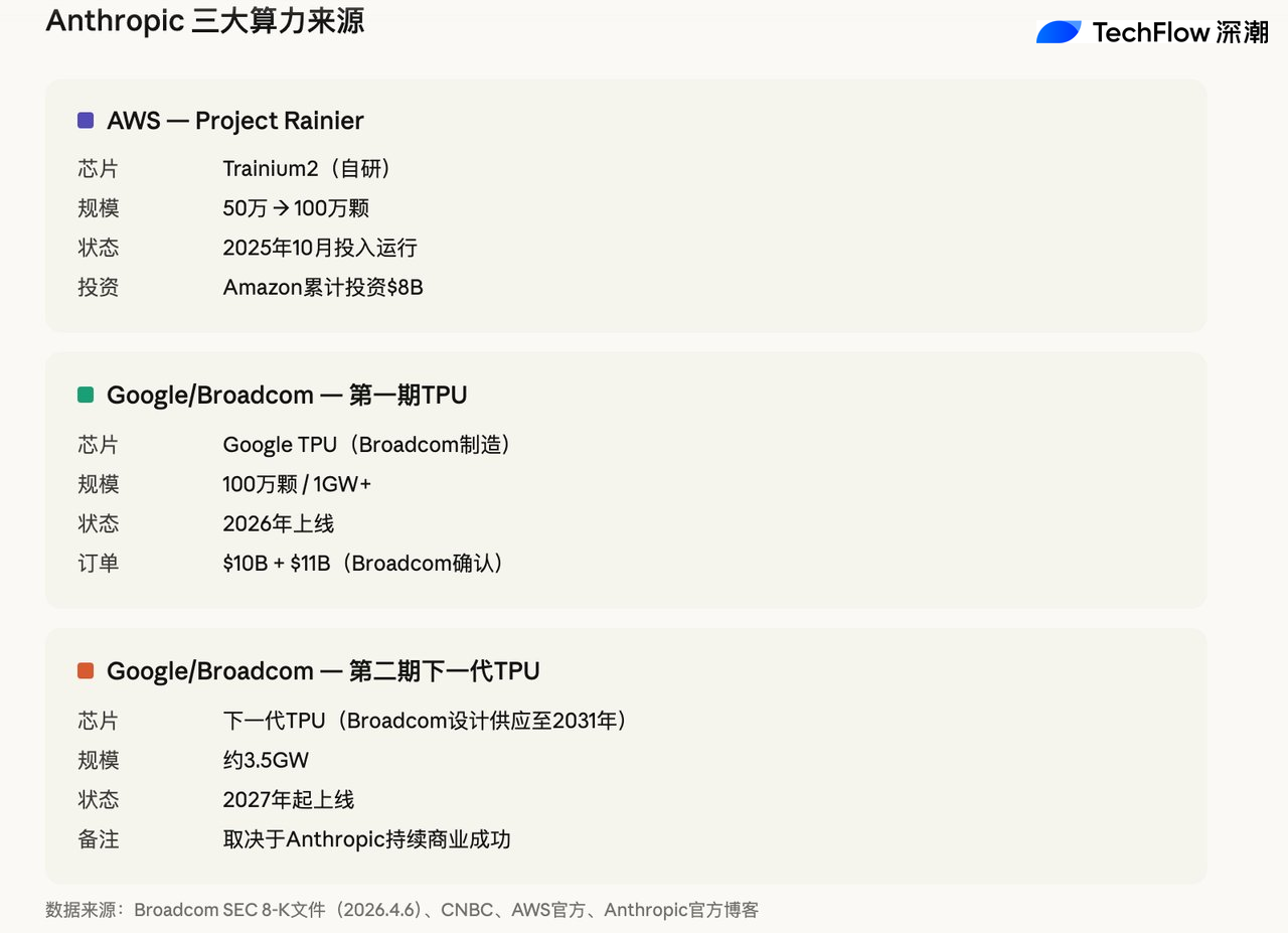 This is not the first time Anthropic has signed a large compute agreement. In October 2025, Anthropic and Google Cloud signed a collaboration agreement to gain access to up to 1 million TPU units, expected to bring more than 1 gigawatt of compute in 2026. At a December 2025 earnings call, Broadcom CEO Hock Tan confirmed that Anthropic placed two TPU orders of $10 billion and $11 billion, respectively. At this year’s March earnings call, Tan further said that the company expects to receive about $21 billion in AI revenue from Anthropic in 2026 and more than $42 billion in 2027 (estimated by Mizuho analysts).