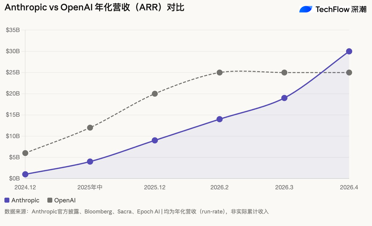 Anthropic’s revenue curve has no precedent in the AI industry. According to timelines reported in public disclosures and multiple media outlets including Bloomberg: about $1 billion in December 2024, about $4 billion in mid-2025, about $9 billion at the end of 2025, about $14 billion in February 2026, nearing $19 billion in early March, and official confirmation of a breakthrough to $30 billion on April 6.
