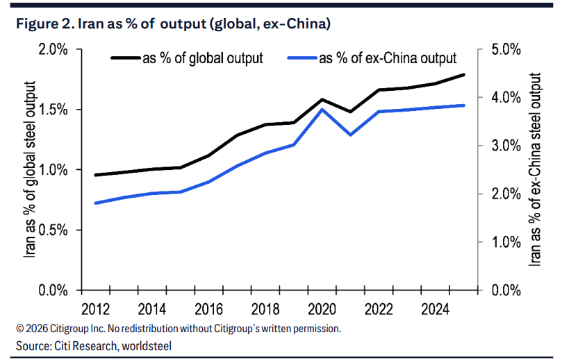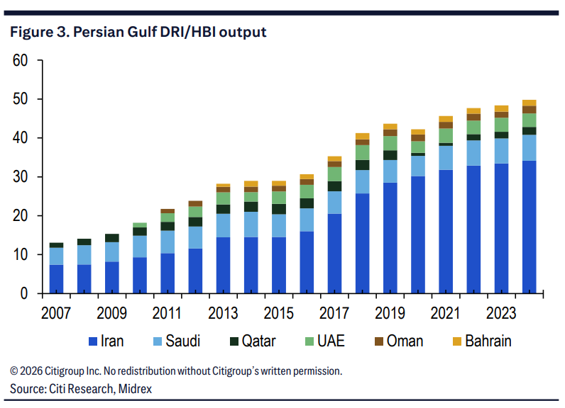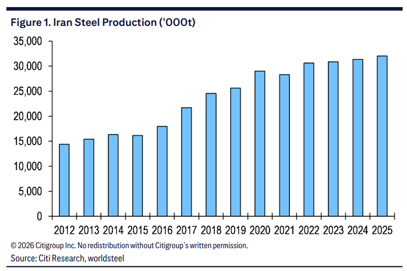 Citi states that Iran’s steel production is highly dependent on gas-based direct reduced iron (DRI) processes, which are entirely different from the global mainstream blast furnace ironmaking pathway, making the difficulty of substitution rise substantially as well.
