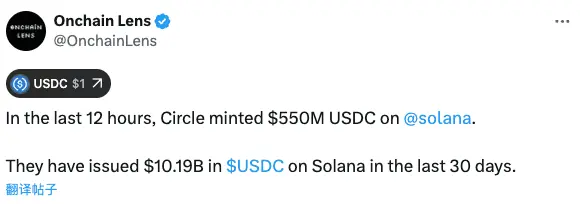 More importantly, this minting cadence did not slow down after the weekly data was released. On April 7, on-chain analysts at Onchain Lens monitored that within the past 12 hours, Circle minted another 550 million USDC on the Solana network, bringing the cumulative USDC issued on the Solana chain over the past 30 days to $10.19 billion. In other words, this minting event was not an isolated spike, but an accelerated release based on a monthly scale that had been expanding continuously.
