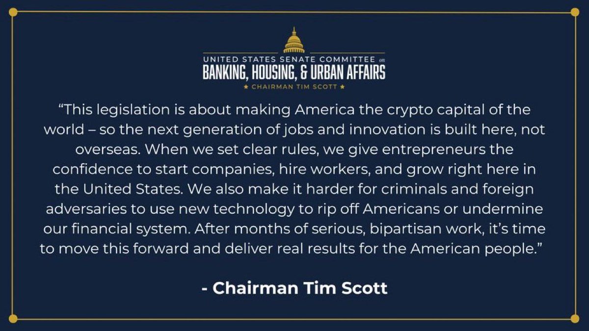 Em uma declaração pública, Tim Scott, presidente do Comitê do Senado de Bancos, destacou que a legislação foi projetada para consolidar a próxima geração de inovação financeira dentro dos Estados Unidos, e não no exterior.