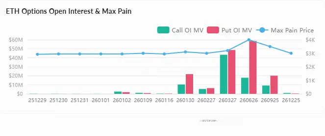 O volume total de opções é de $6,12 mil milhões (+0,87% em 24h), com maior concentração de dor na faixa de $2.950-$3.000, criando um efeito de magnetismo com o preço atual.