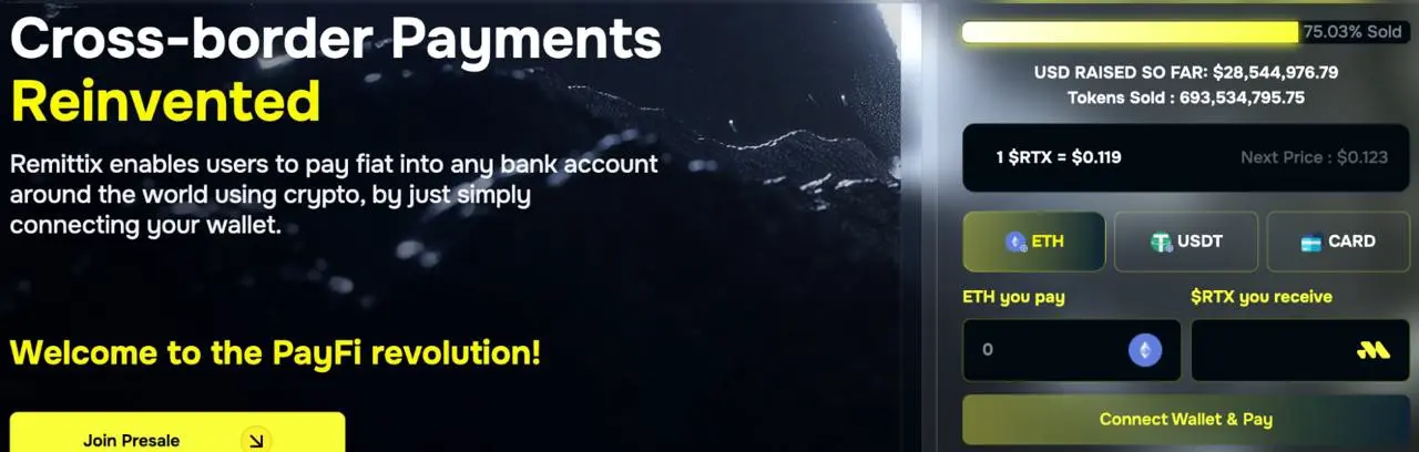 A Remittix posiciona-se como uma rede de pagamentos e remessas de próxima geração, com o objetivo de simplificar transferências de criptomoedas para fiat. O projeto busca fornecer conversões instantâneas entre criptomoedas e mais de 30 moedas fiduciárias, permitindo transferências diretas de carteira para banco com taxas baixas e liquidação de FX em tempo real. Até agora, sua pré-venda de criptomoedas arrecadou mais de $28M, indicando um influxo poderoso de capital.