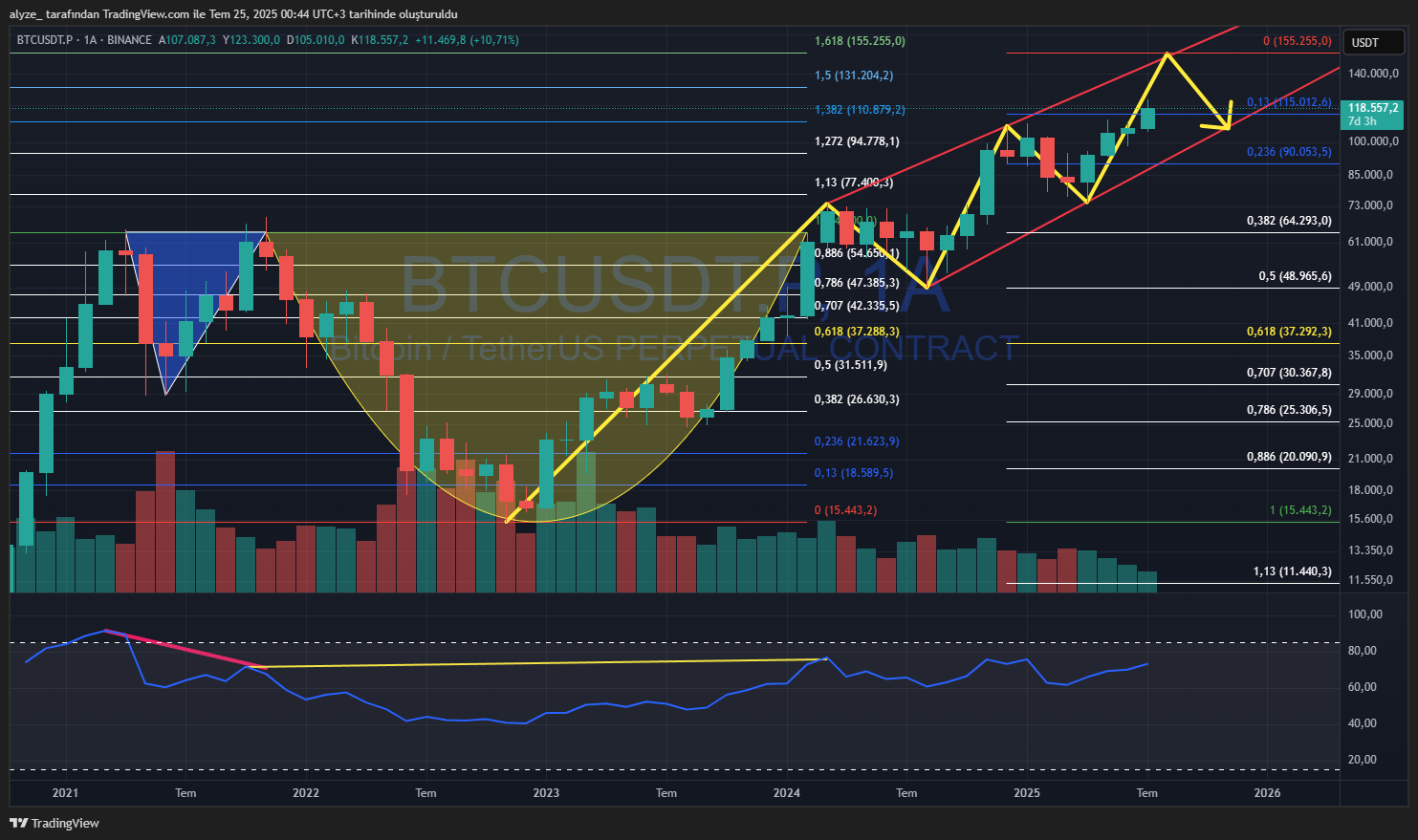 Формация “чашка с ручкой”, образованная между 2021 и 2024 годами, нацелена на $267,722 — но я не ожидаю, что это произойдет уже сейчас. Сначала уровень 1.618 по Фибоначчи на $155,255 выступает в качестве сильного сопротивления, как это было в прошлых циклах.