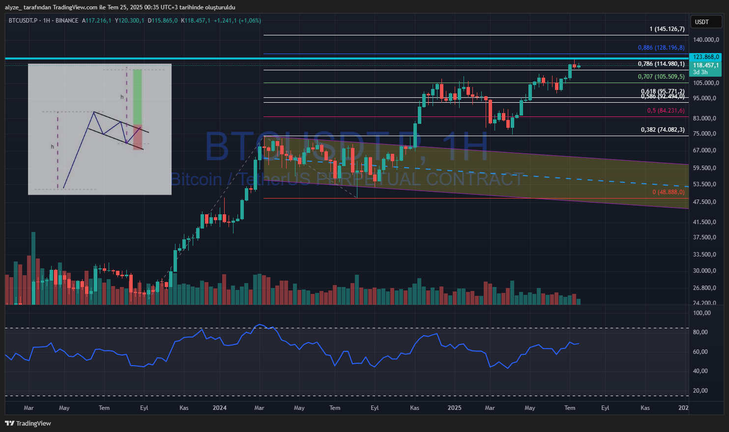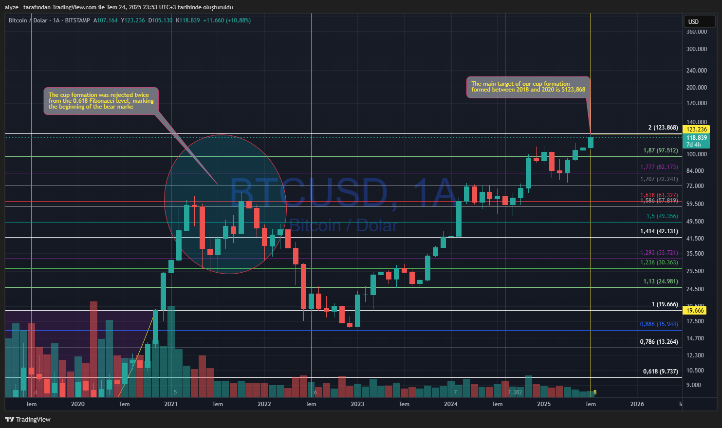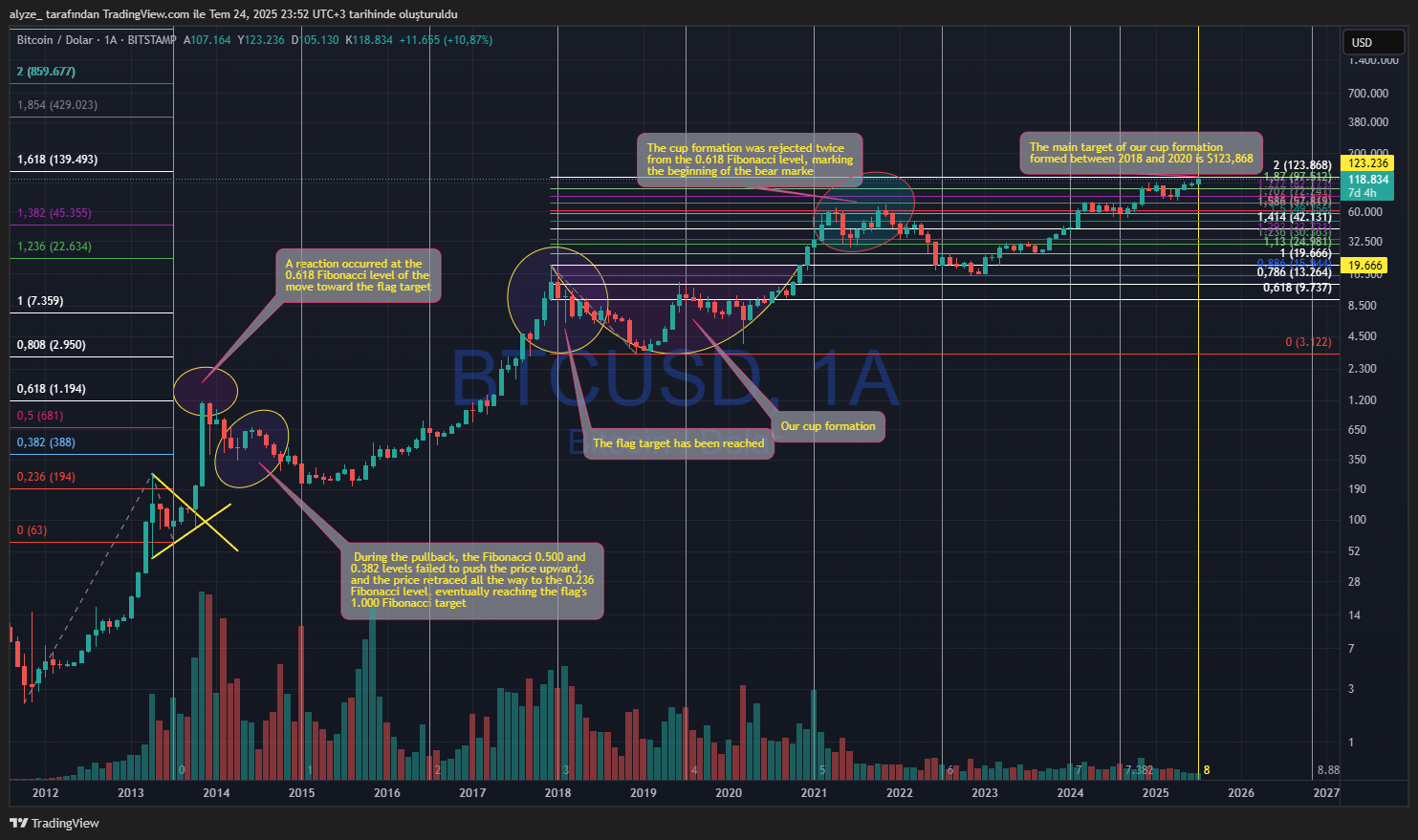 В этом анализе мы предположим, что технические данные для BTC начинаются с 2012 года. В предыдущем посте мы упоминали $123,868 — теперь мы исследуем, что означает этот уровень.