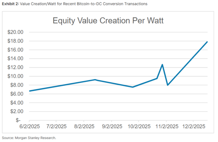 К чему это приведет? По мнению Morgan Stanley, с помощью ИИ. Сегодня брокер пересчитывает, насколько выгодно превратить крупнейшие публичные компании по майнингу биткоинов в дата-центры и обнаруживает, что экономика этого гораздо привлекательнее: