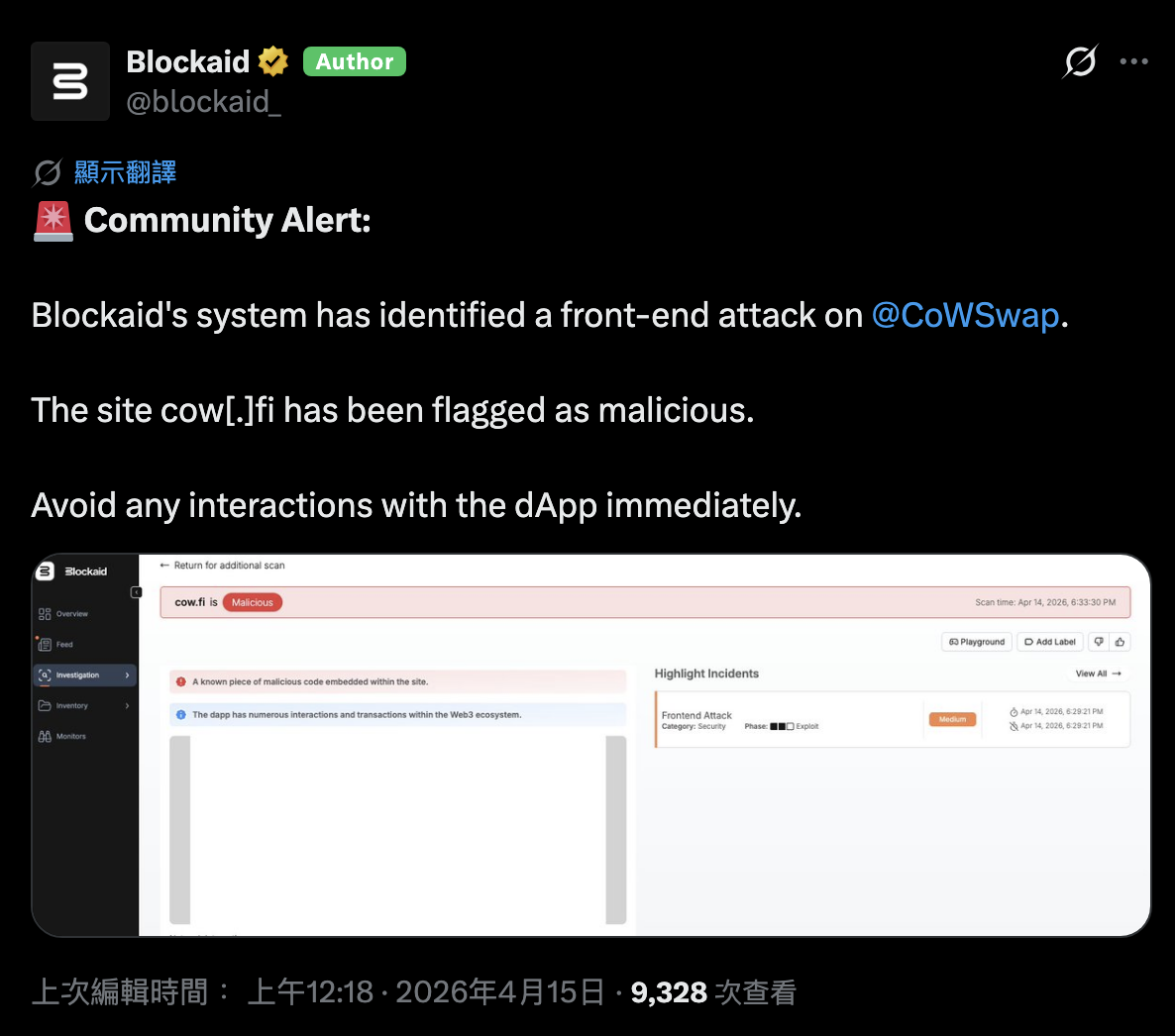 Эта поддельная страница очень похожа на настоящую, ее основная цель — обмануть пользователей, чтобы они подключили кошельки и подписали вредоносные разрешения, похищая активы. Blockaid сразу же в социальных сетях X выпустил срочное предупреждение, указав, что cow.fi помечен как вредоносный сайт, и настоятельно рекомендовал всем пользователям немедленно прекратить взаимодействие с этим приложением.