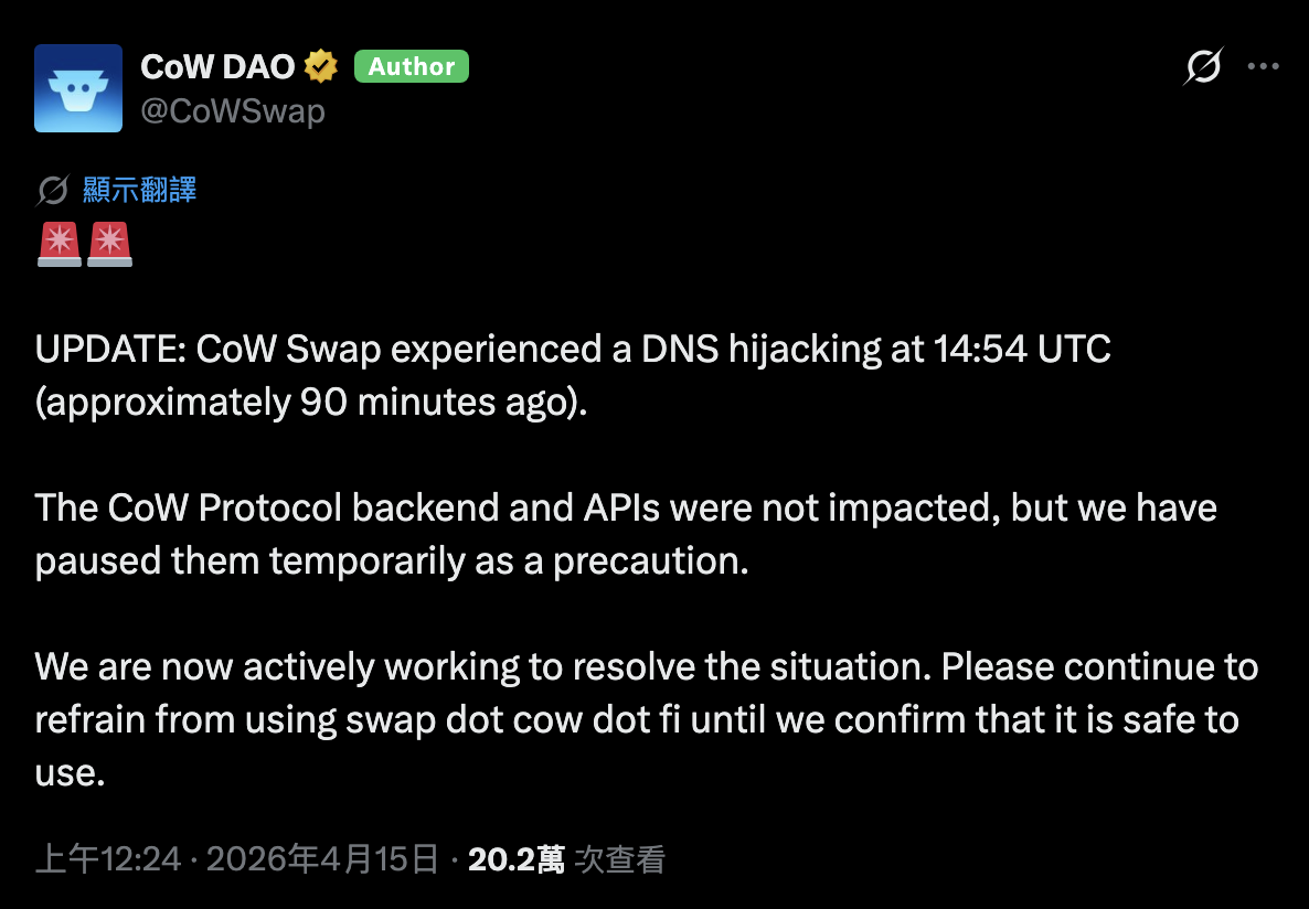 CoW Swap подвергся атаке DNS-подмены! Предварительная оценка потерь пользователей — миллионы долларов, официальные лица: не используйте веб-страницу на фронтенде