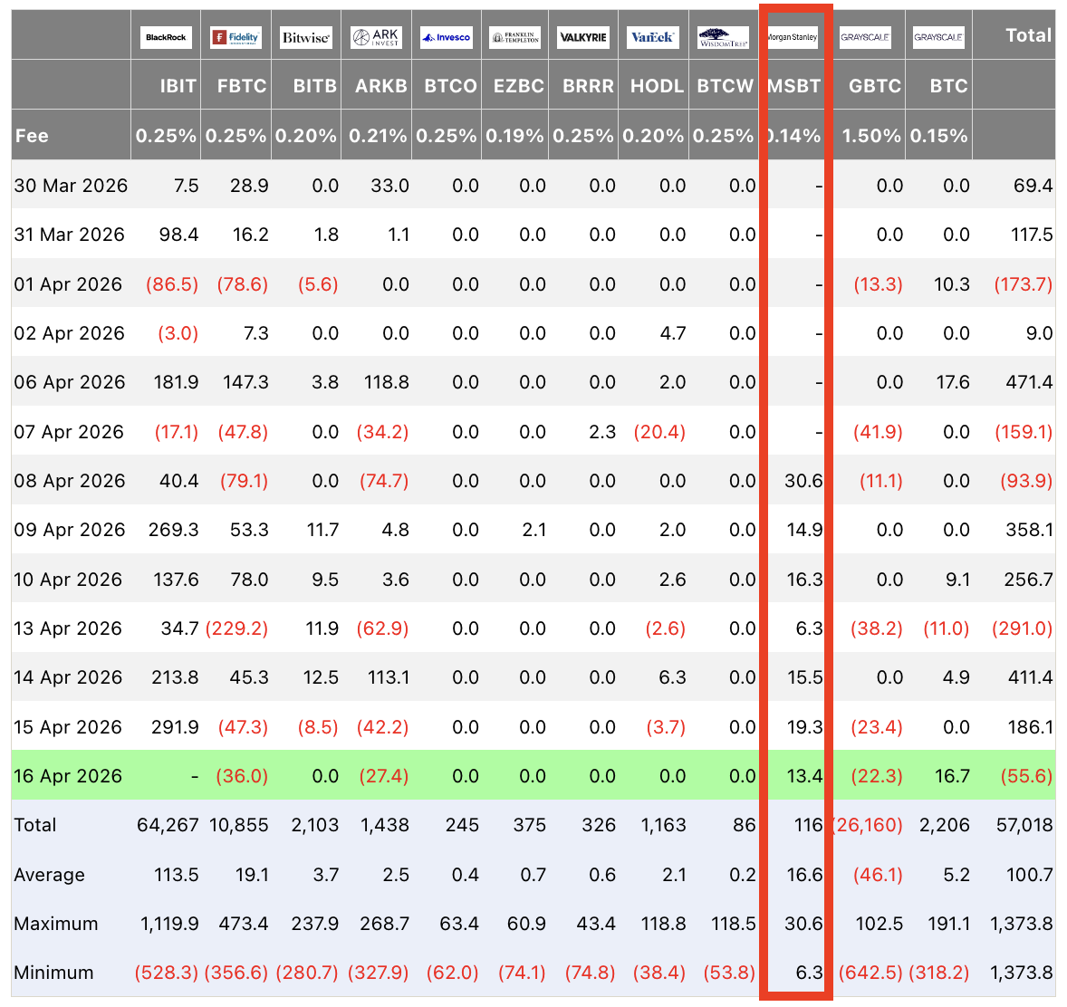 13 американских спотовых биткойн ETF продолжают расширять свое влияние. По состоянию на 16 апреля совокупные активы этих фондов достигли 97,6 миллиарда долларов, что примерно составляет 6,5% от общей рыночной капитализации биткойна. 15 апреля в целом по рынку зафиксирован чистый приток в 186 миллионов долларов. Хотя объем активов MSBT и уступает 643 миллионам долларов у IBIT от BlackRock, его темпы роста уже угрожают таким крупным игрокам, как Franklin, Valkyrie и Invesco, с притоком в диапазоне от 200 до 400 миллионов долларов.