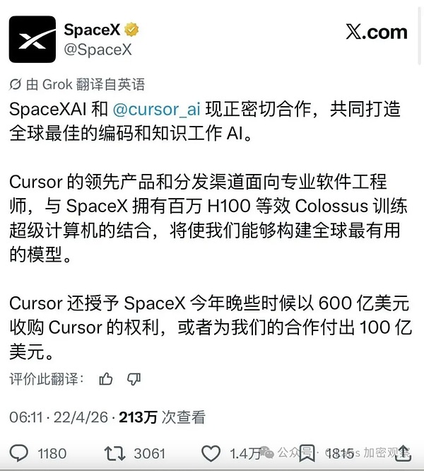 Первая: SpaceX объявила о стратегическом партнерстве с Cursor, предоставив SpaceX право купить Cursor за 60 миллиардов долларов или заплатить 10 миллиардов долларов за развитие совместного проекта.
