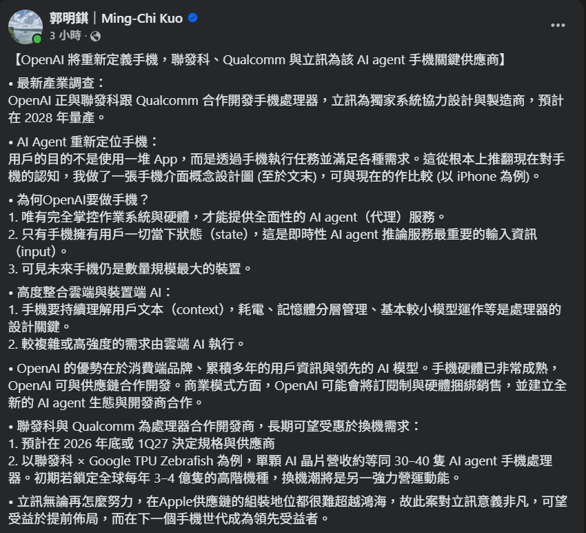 Передает, что OpenAI собирается выпустить мобильный телефон? Го Мингчжун назвал MediaTek, Qualcomm и Luxshare в качестве ключевых поставщиков