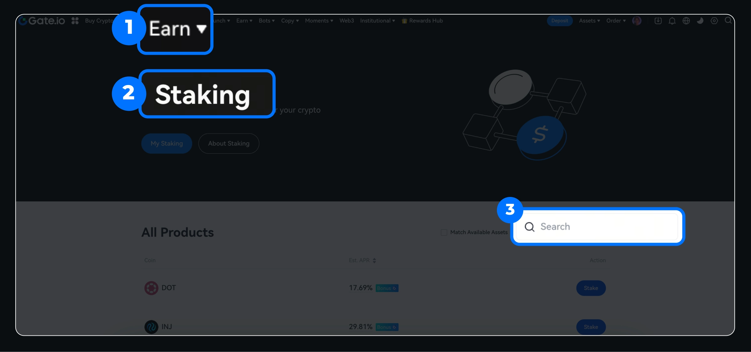 App: Trade - Earn - Staking - Select products according to currency and terms