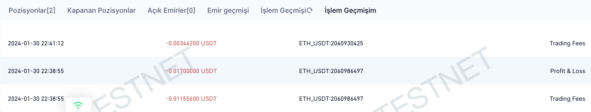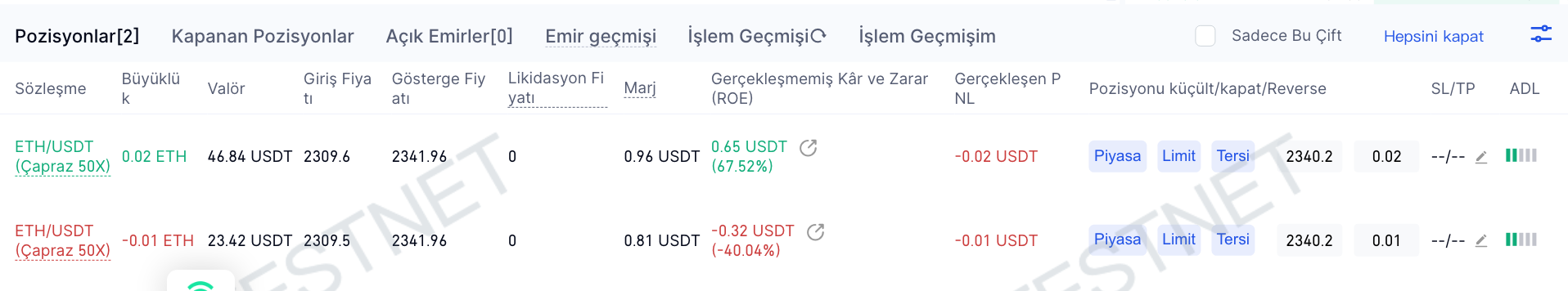 Kısacası, iki taraf için Pozisyonlar sekmesindeki [Gerçekleşen PNL + Gerçekleşmeyen PNL] = İki taraf için İşlem Geçmişindeki [Gerçekleşen PNL] + Cüzdandaki [Gerçekleşmeyen PNL].